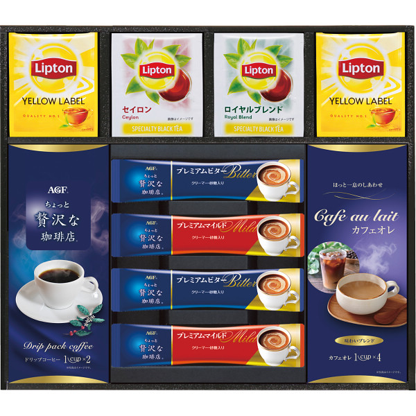 ・商品内容:リプトン イエローラベルティーバッグ2g×6、AGFちょっと贅沢な珈琲店オリジナルブレンド(ドリップ)8g×4、AGFちょっと贅沢な珈琲店プレミアムビター(スティック)7g・AGFちょっと贅沢な珈琲店プレミアムマイルド(スティック)7g・リプトン ロイヤルブレンドティーバッグ2.2g・リプトン セイロンティーバッグ2.2g×各3